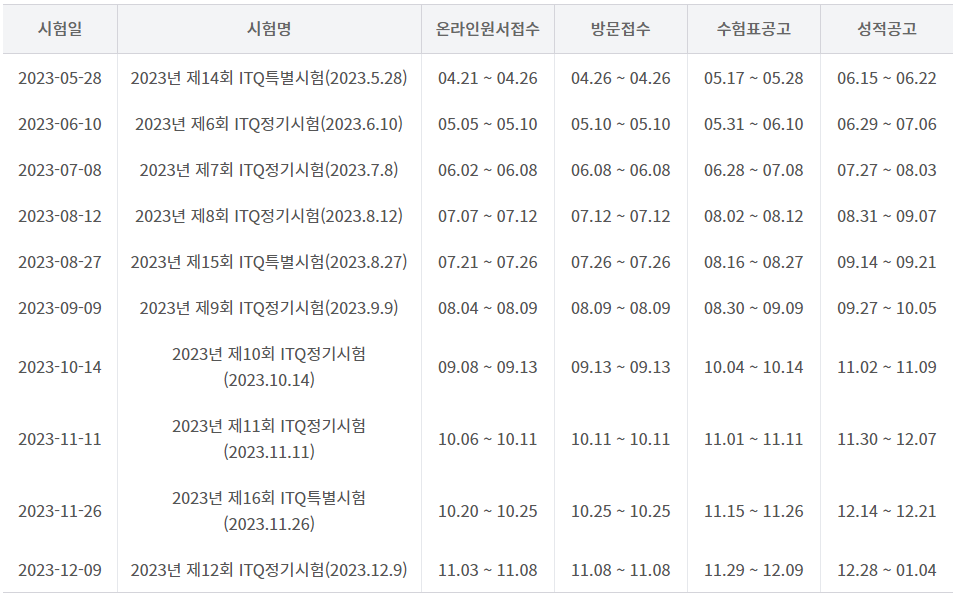 | 시험시간은 어떻게 되나요? | ITQ 시험은 1, 2, 3교시로 나뉘어져 시작됩니다. 1교시는 9시부터 10시 / 2교시는 10시30분부터 11시 30분 / 3교시는 12시부터 13시까지로 시험시간은 1시간으로 구성되어 있습니다. |